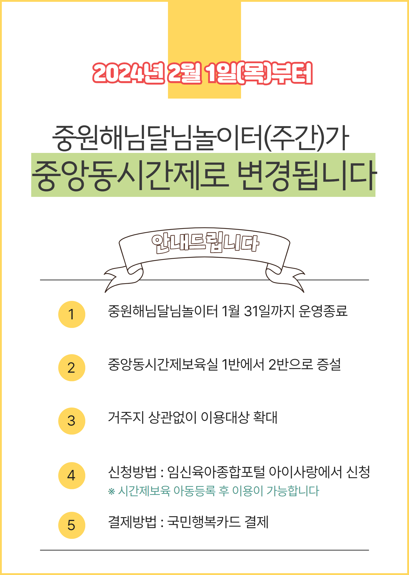 중원해님달님놀이터(주간), 중앙동시간제보육실로 변경 안내