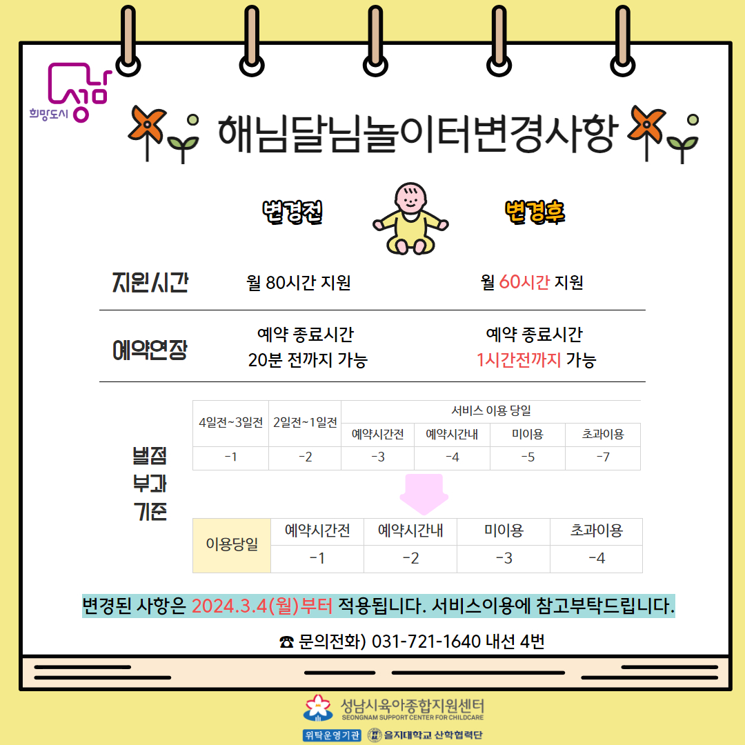 중원해님달님놀이터(주간), 중앙동시간제보육실로 변경 안내