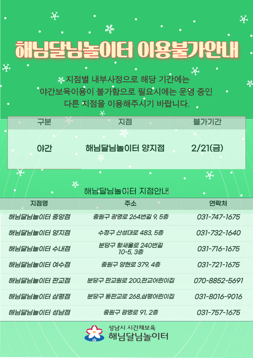 해님달님놀이터 설연휴 이용불가안내